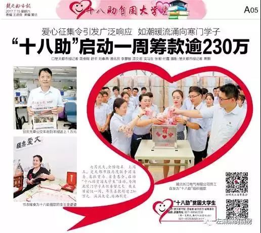 致富思源,反哺社會,積極參與助學(xué)、賑災(zāi)、關(guān)愛留守兒童、關(guān)愛老人、助力城市發(fā)展等公益事業(yè),不僅是和諧企業(yè)的需要,更是一份社會責(zé)任。近年來公司贊助武漢網(wǎng)球公開賽、參與《楚天都市報》“十八助”愛心助學(xué)活動、為阿拉善?SEE拯救江豚項目捐款等,還受到媒體廣泛關(guān)注。