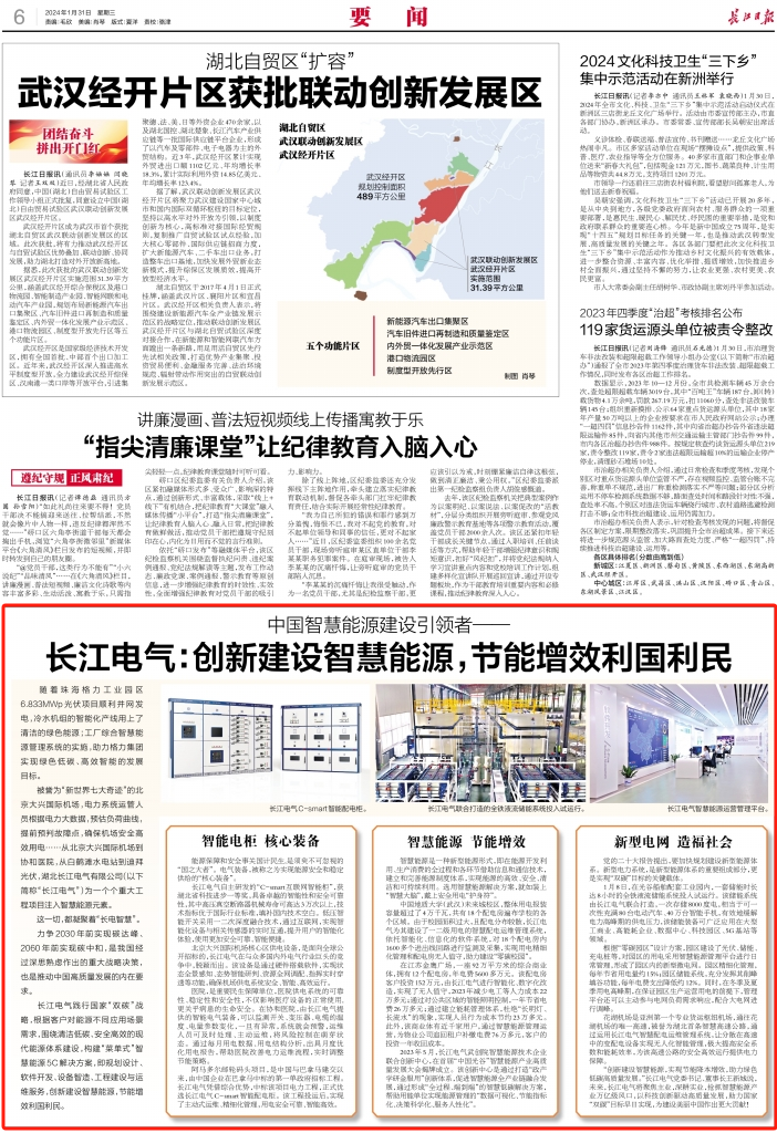 2024年1月31日,《湖北日?qǐng)?bào)》和《長(zhǎng)江日?qǐng)?bào)》均在要聞版,以《中國(guó)智慧能源建設(shè)引領(lǐng)者——長(zhǎng)江電氣:創(chuàng)新建設(shè)智慧能源 節(jié)能增效利國(guó)利民》為題,專題報(bào)道長(zhǎng)江電氣高質(zhì)量發(fā)展。