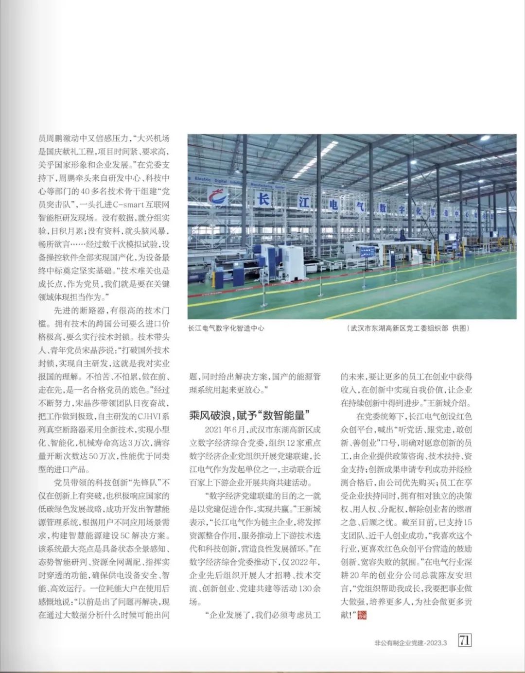 2023年3月《非公有制企業黨建》雜志,在“走進雙強——爭雙強?當先鋒”欄目,以《擎旗闊步,智慧能源“加速跑”》為題,聚焦報道長江電氣在“紅色電流,數智能量”黨建工作法之下,如何以高質量黨建引領企業高質量發展事跡。