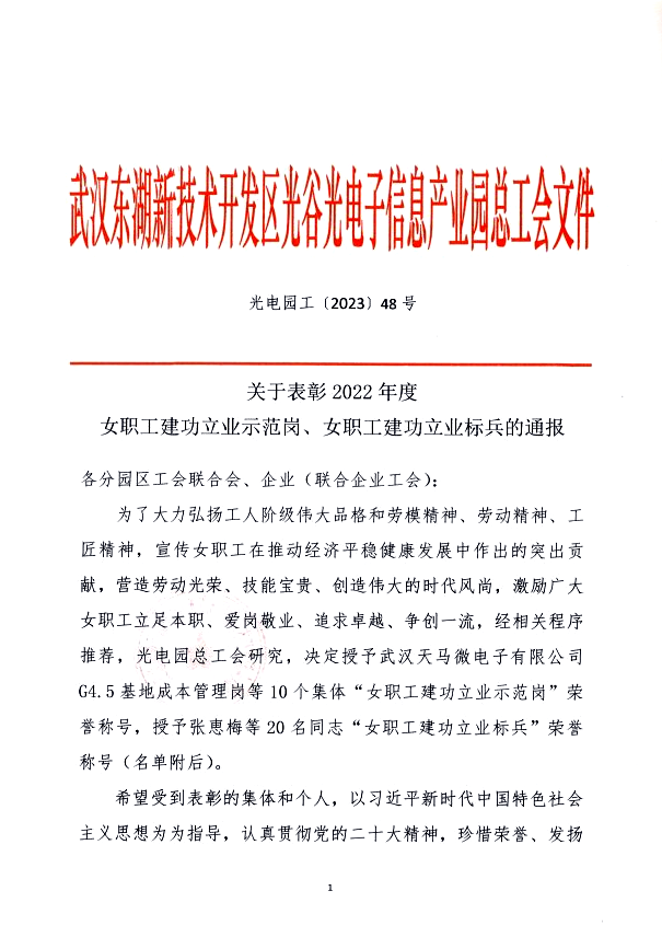 3月3日,武漢東湖高新區光電園總工會發布表彰通知,長江電氣黨辦榮獲2022 年度“女職工建功立業示范崗”榮譽稱號。